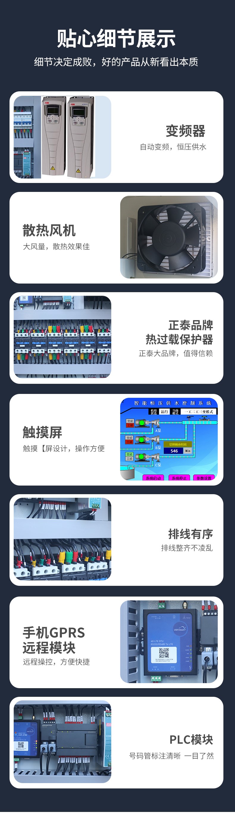 支持多種控制模式(如液位、壓力、溫度、時(shí)間控制),具備自動(dòng)巡檢、故障記憶、遠(yuǎn)程監(jiān)控、定時(shí)換泵、小流量休眠等功能,減少人工干預(yù),實(shí)現(xiàn)無(wú)人值守 。