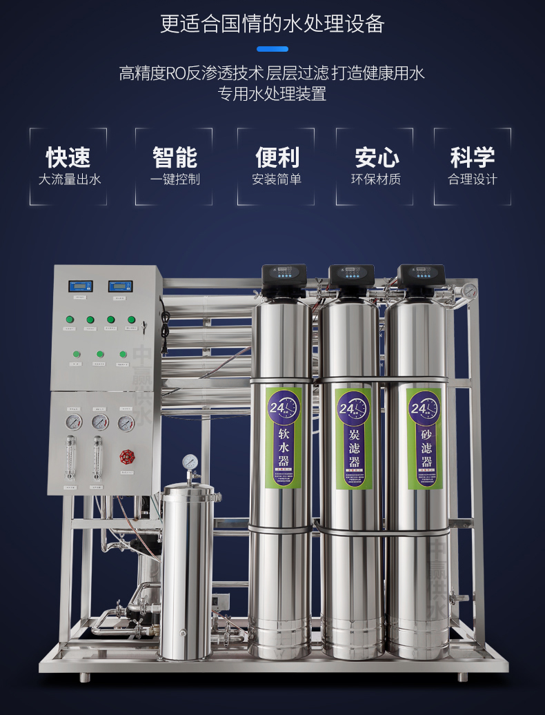 采用多次過濾層的過濾器,主要目的是去除原水中含有的泥沙、鐵銹、膠體物質、懸浮物等顆粒在20um以上的物質,可選用手動閥門控制或者全自動控制器進行反沖洗、正沖洗等一系列操作。保證設備的產水質量,延長設備的使用壽命。
